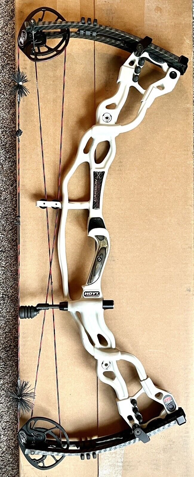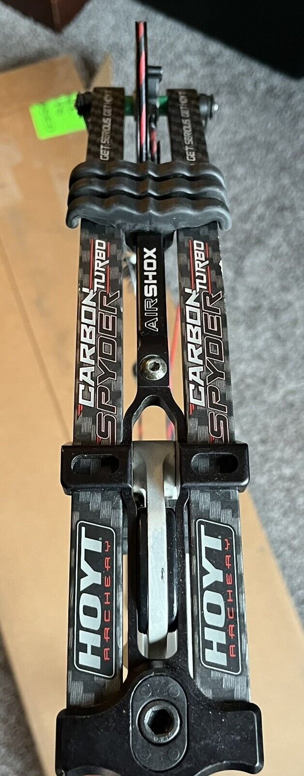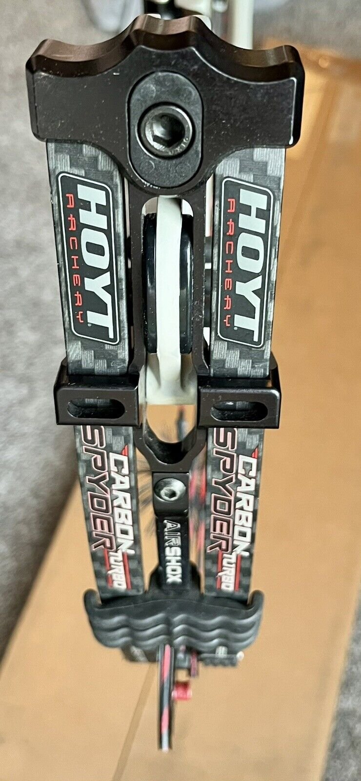 LH Hoyt Carbon Spyder Turbo compound bow. There are a few blemishes in the finish, around the riser area, overall in good working mechanical condition. Ultralight, compact and fast!!
